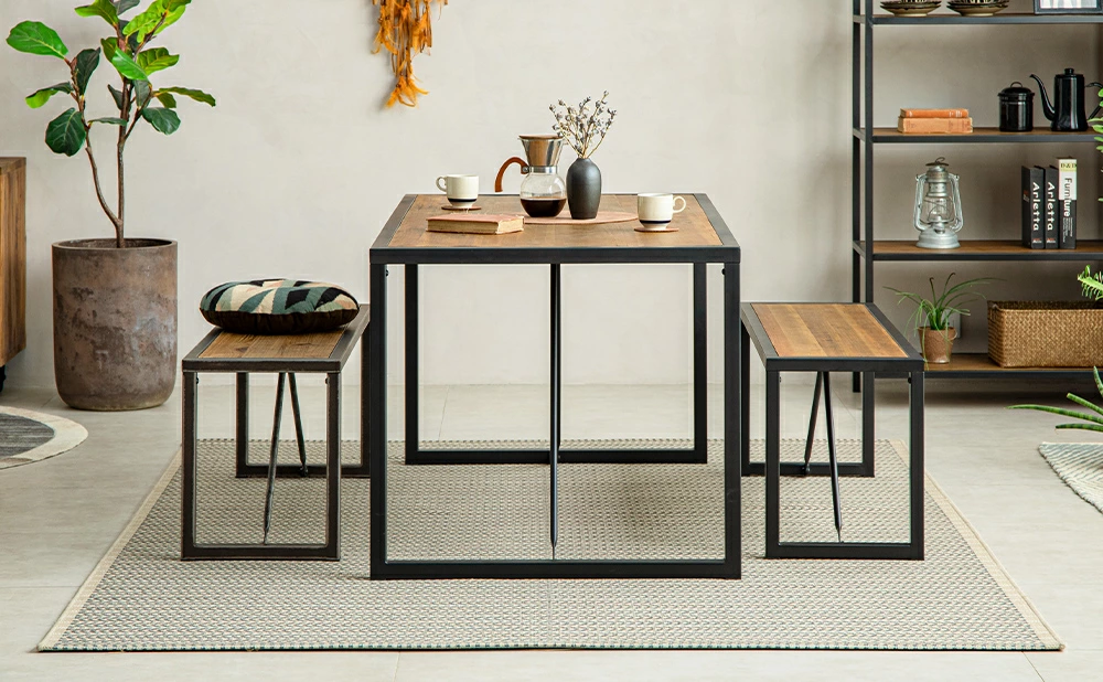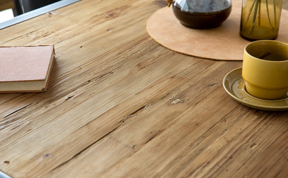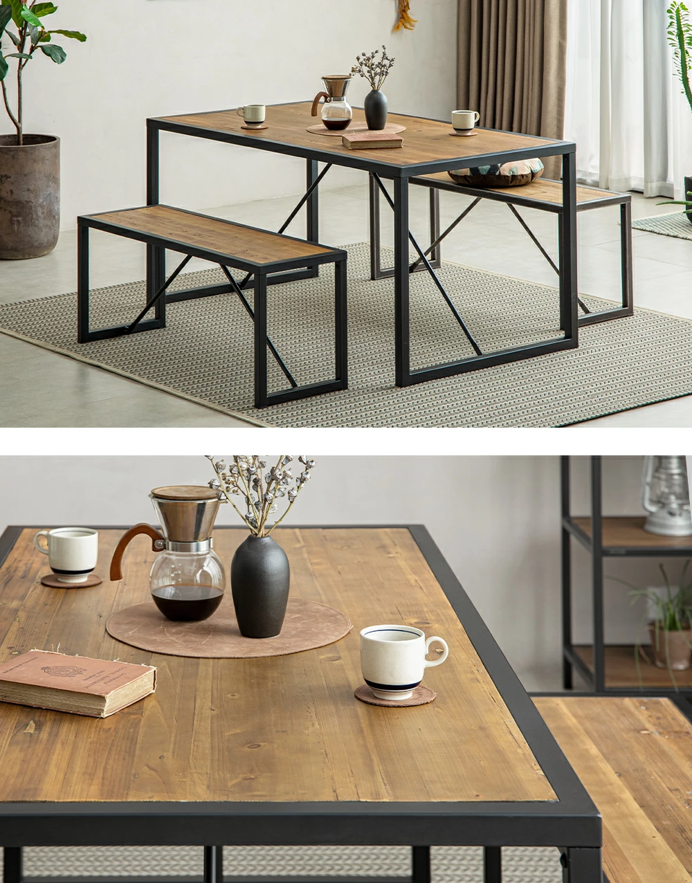 杉古材がもつ独特の味わいと重厚な金属の風合いが調和する。長い年月を経た古材にしか醸し出せない、逞しく無骨な美しさを堪能できるダイニングセットです。