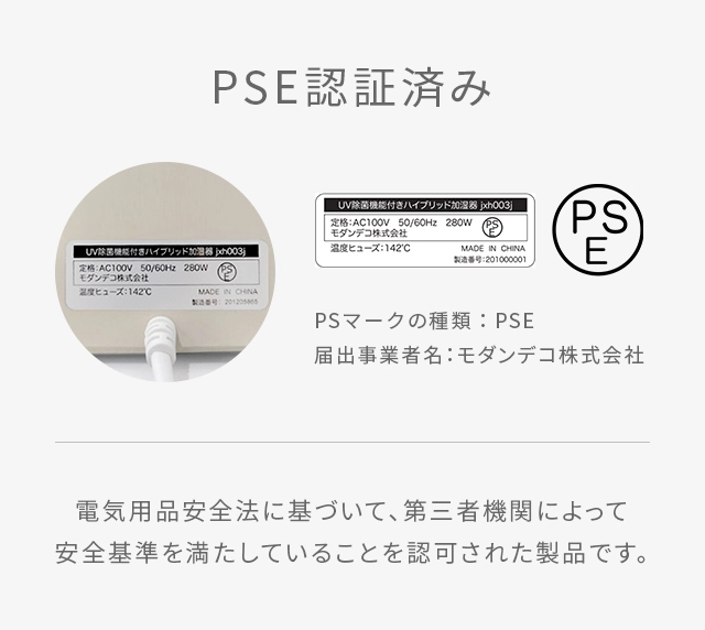 電源:AC100V 50/60Hz 消費電力:280W(ヒーター機能ON)、25W(ヒーター機能OFF) タンク容量:6.5L 加湿量:ヒーター機能ON 550ml/h、ヒーター機能OFF 300ml/h 連続加湿時間:60時間(ヒーター機能OFF、弱モード時) 適用床面積:和室10畳、洋室17畳