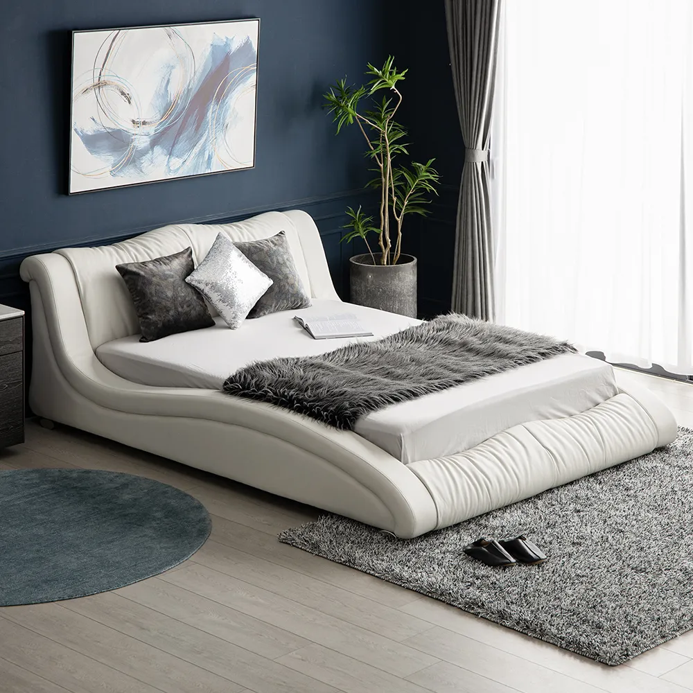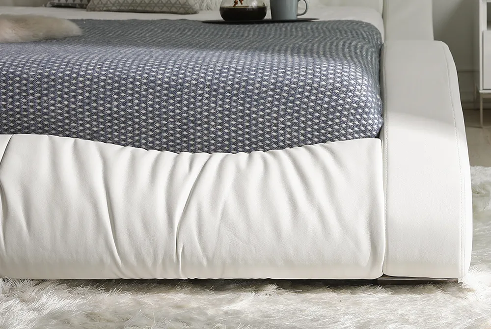 ダイナミックな流線型のシルエットが魅力の近未来的デザイン。曲線美を追求したレザー張りのボディが、圧倒的な存在感を放ちます。柔らかなカーブを描くヘッドボードは、ソファのようにくつろぐ姿勢を想定して設計されています。波打つラインが一体感を生むフットボードは、どの角度から見ても美しく仕上げられています。艶やかなオーバル型のステンレスレッグは、控えめな輝きを放ちながら、全体のデザインを引き立てます。
