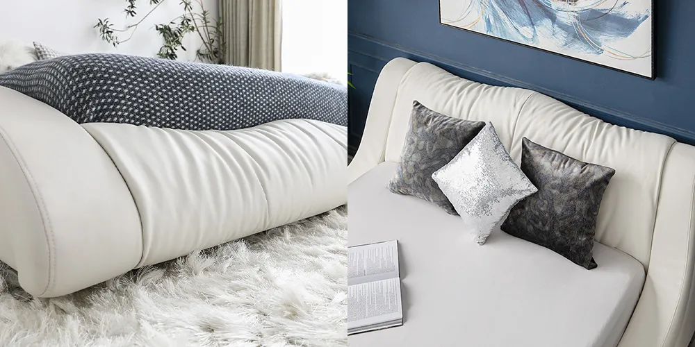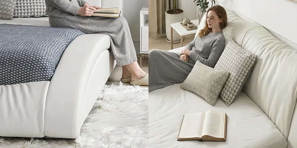 サイドフレームは腰掛けやすい高さで設計され、幅広さと安定感によって快適な掛け心地を実現します。ヘッドボードは背中を広々と受け止め、ハイバックソファのように背中全体をしっかりサポートする適切な高さです。この高さはくつろぎのひとときを提供するだけでなく、優雅な雰囲気を演出します。