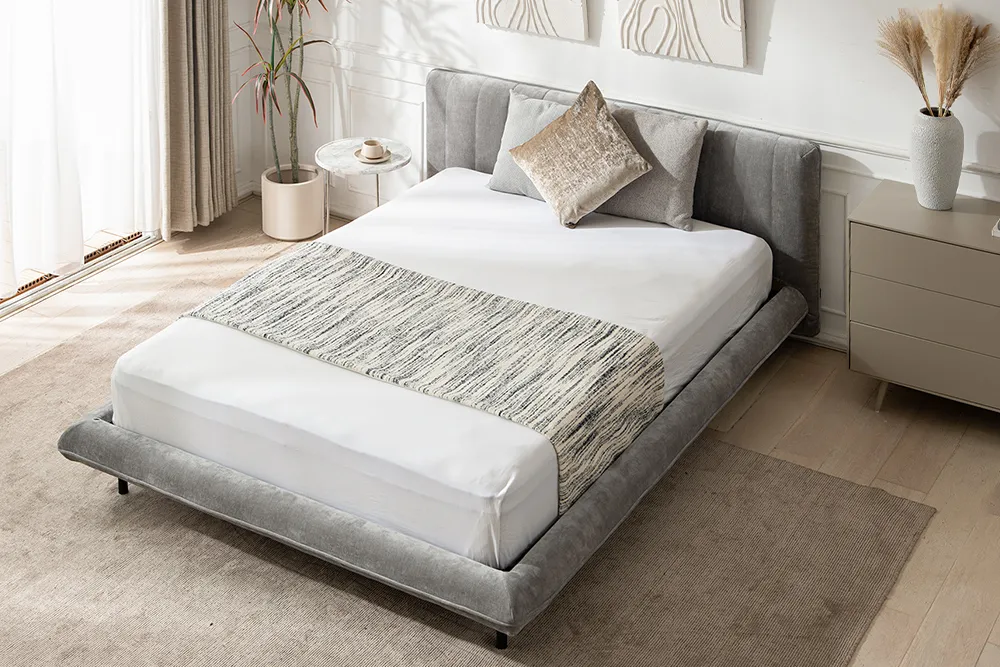 丸みを帯びた曲線と、上質なファブリックが織り成す上品な佇まい。静かなエレガンスを宿したベッドは、落ち着いた寝室空間を演出します。