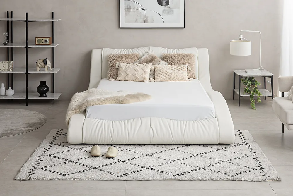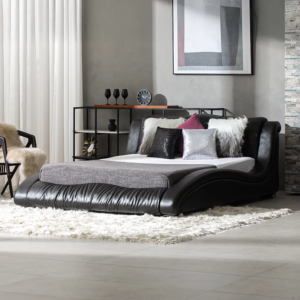 ダイナミックな流線型のシルエットが魅力の近未来的デザイン。曲線美を追求したレザー張りのボディが、圧倒的な存在感を放ちます。柔らかなカーブを描くヘッドボードは、ソファのようにくつろぐ姿勢を想定して設計されています。波打つラインが一体感を生むフットボードは、どの角度から見ても美しく仕上げられています。艶やかなオーバル型のステンレスレッグは、控えめな輝きを放ちながら、全体のデザインを引き立てます。