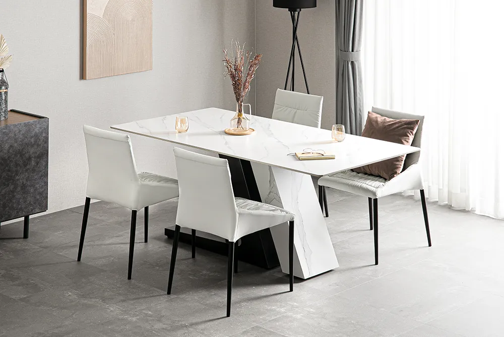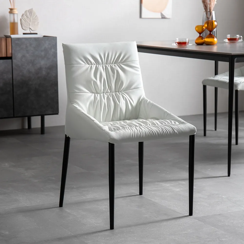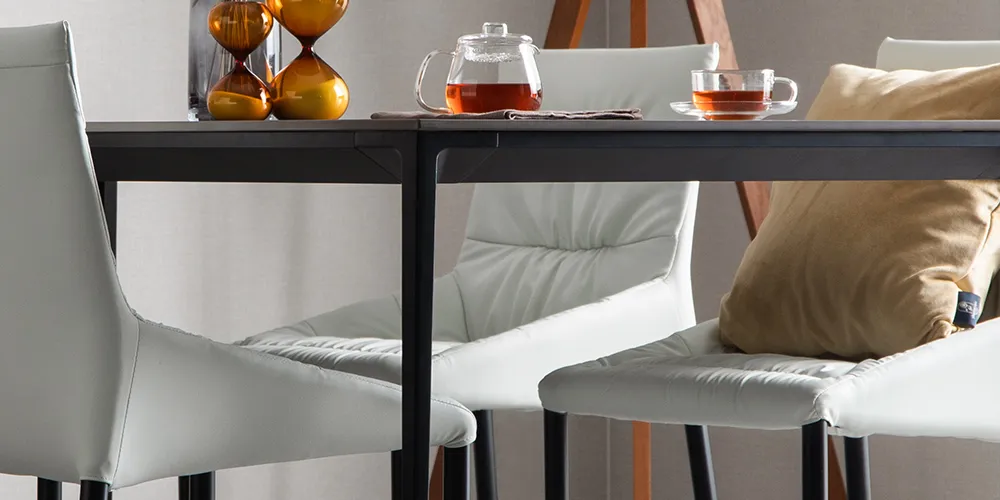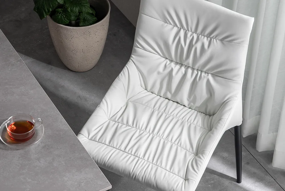 華やかなギャザーデザインのレザーとシャープなステンレスレッグで軽やかさをプラスし、ダイニングに洗練された印象を与えます。しなやかなレザー素材で仕上げたシートは、体のラインをやさしく包み込み、日々の快適な食卓シーンに寄り添います。