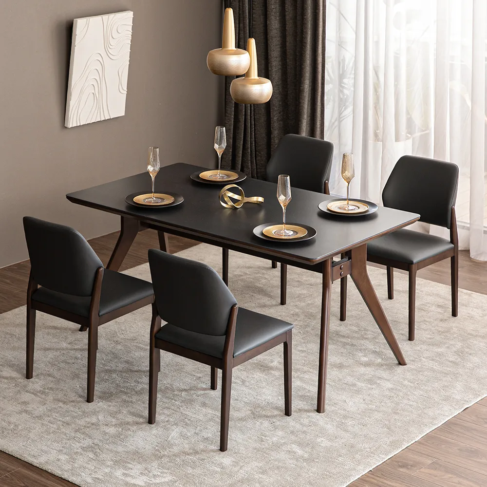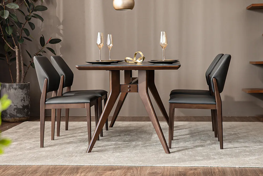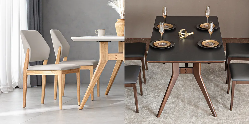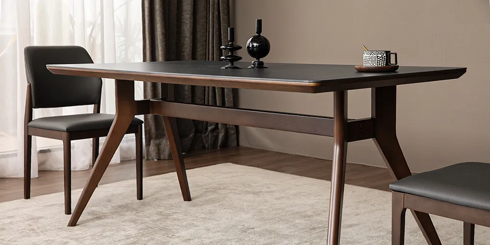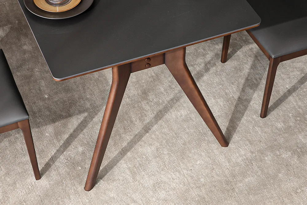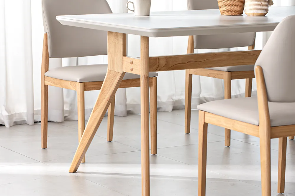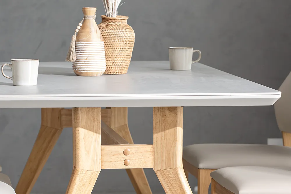 繊細な石目の質感を再現したセラミック天板に、優しい木目のウッド調レッグを合わせ、絶妙なツートンデザインに仕上げました。無駄な装飾を排除したフラットな天板はテーブルトップの素材感を強調し、軽やかな印象を与えます。