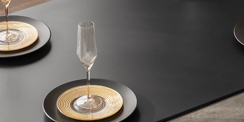 天板のサイドは斜めにカッティングを施すことで、フラットなセラミックトップが映える仕様に。約33mmのMDFとセラミックを合わせた厚手の天板でありながら、圧迫感が無いすっきりとした見た目を実現しました。