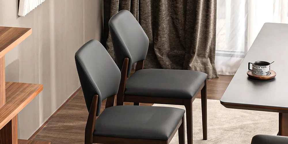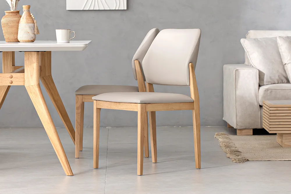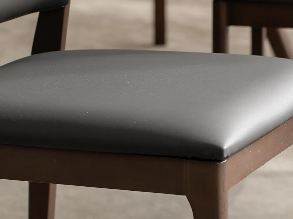 チェアの座面部分は水分や傷に強いPVCレザーを採用。本革さながらの高級感漂う風合いと、ケアのしやすさを実現した、日常使いに寄り添う素材です。