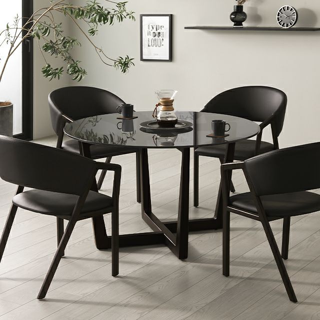 軽やかな印象をもたらすガラスのテーブルトップ。自然光や照明光を取り込み、リビングの表情を変化させます。空間に美しく収まる円形シルエットで、ダイニングやリビングの中心に設置してもスムーズな動線を確保します。