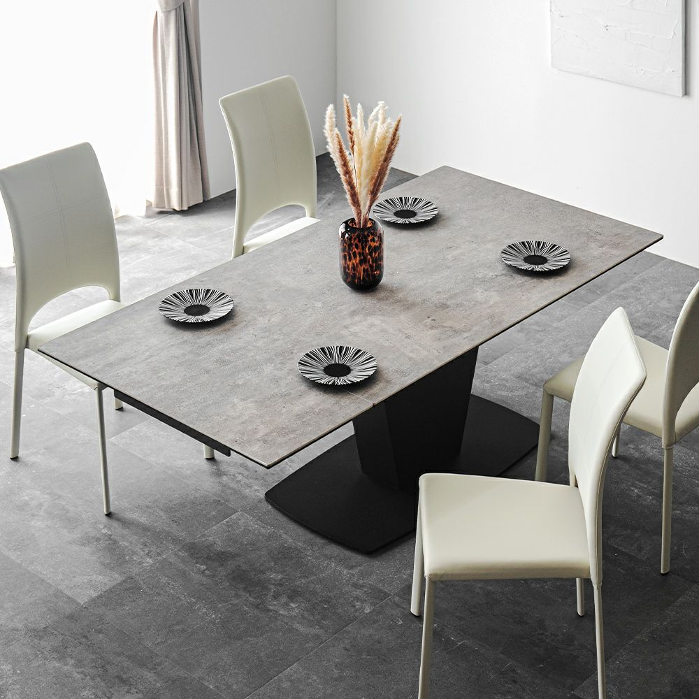 スマートな見た目と機能性を追及した伸縮式テーブル。天然石さながらの凹凸を感じられる天板が、重厚感を放ちながらも柔らかな雰囲気で空間に落ち着きを与えます。セラミックとスチールの異素材が引き立て合う、ダイニングの主役にふさわしい一台です。