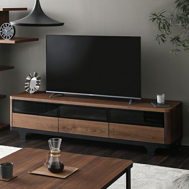 重厚なウッドと美しいグレーのガラスが互いを惹き立て合う、気品のあるフロントデザイン。スチール脚のマットな質感がアクセントになった、絶妙なバランスが美しいテレビボードです。