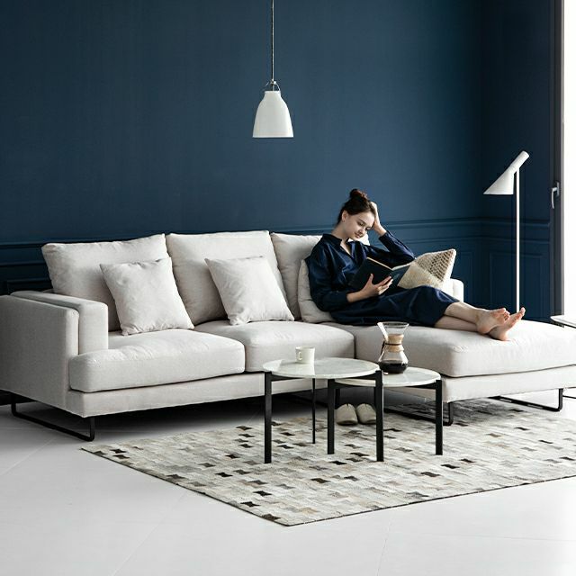 広いスペースを確保できるソリッドなアームは、さりげないレイヤードデザインでソファの統一感を高めます。ナローなフレームタイプのレッグは、深みのあるマットブラックの質感が空間を引き締めながら軽やかな印象をもたらします。