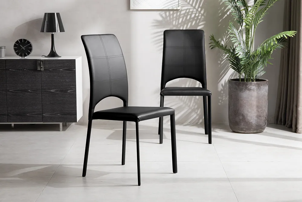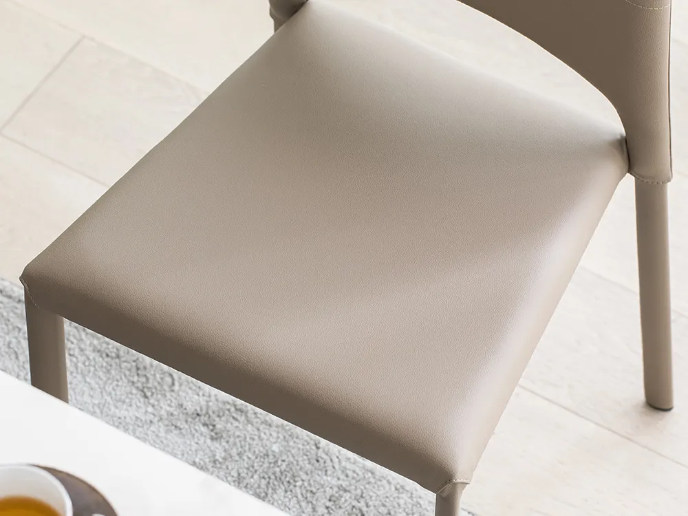 背面から脚先にいたるまで、本革さながらのしなやかな風合いと摩擦や傷に強く耐水性に優れたEPUレザーで覆い尽くした贅沢なチェア。シャープな輪郭にアーチラインを施した、置くだけで絵になる造形です。