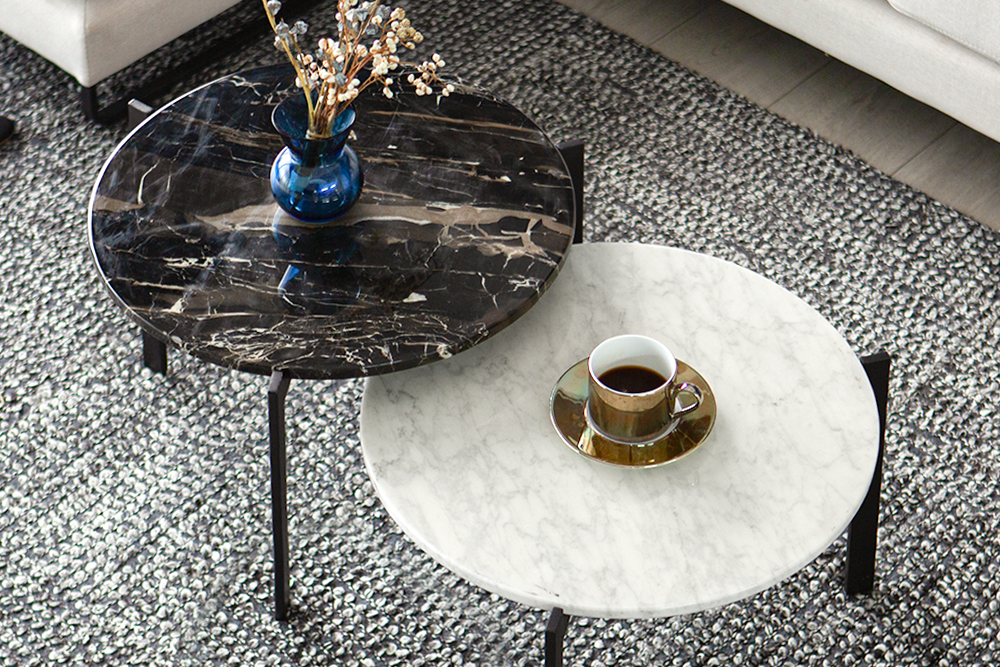 気品あふれる天然大理石が美しいネストテーブル。組み替えできるデザインで実用性も兼ね備えた一台に仕上げました。