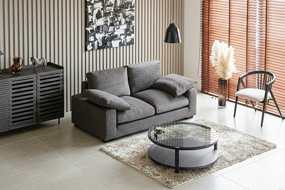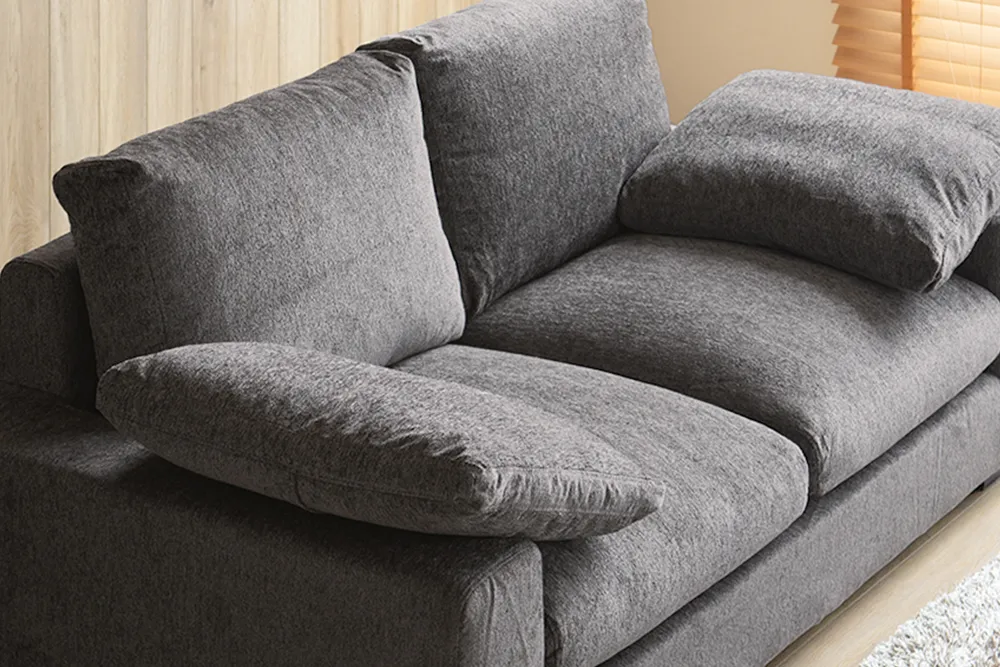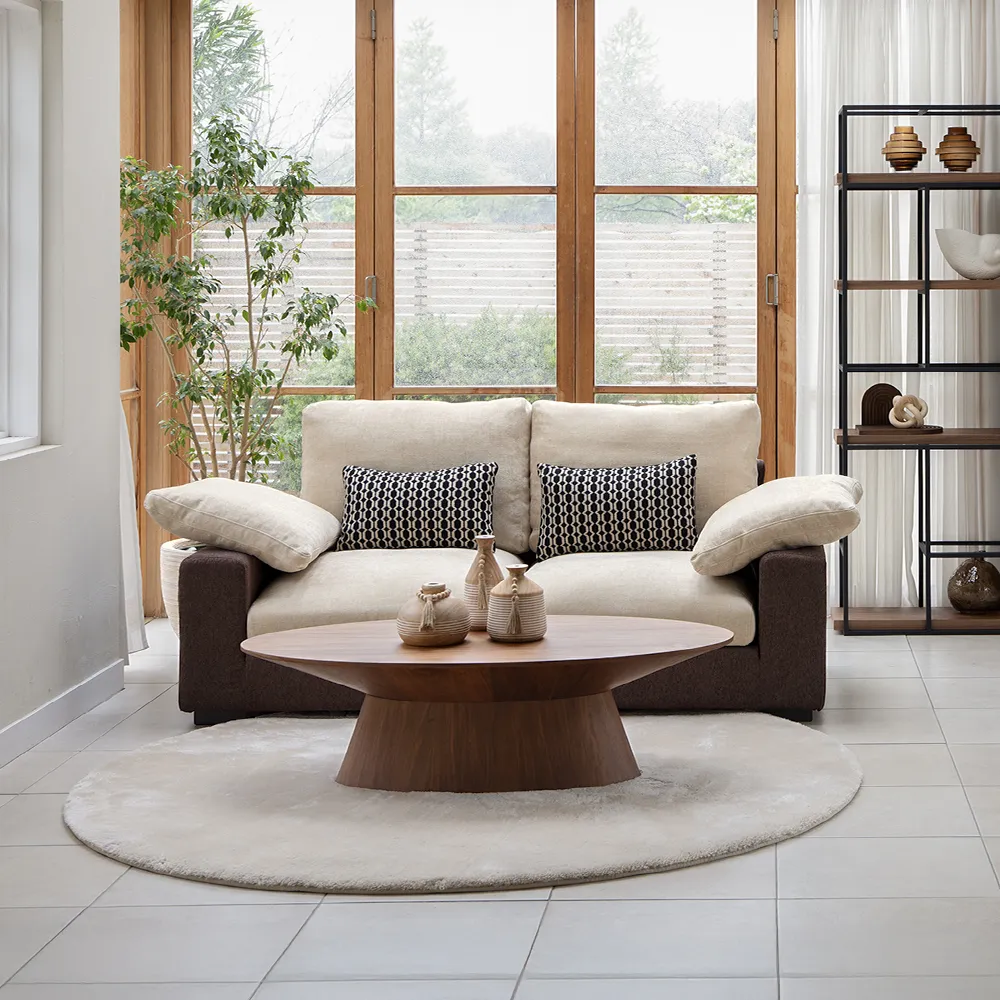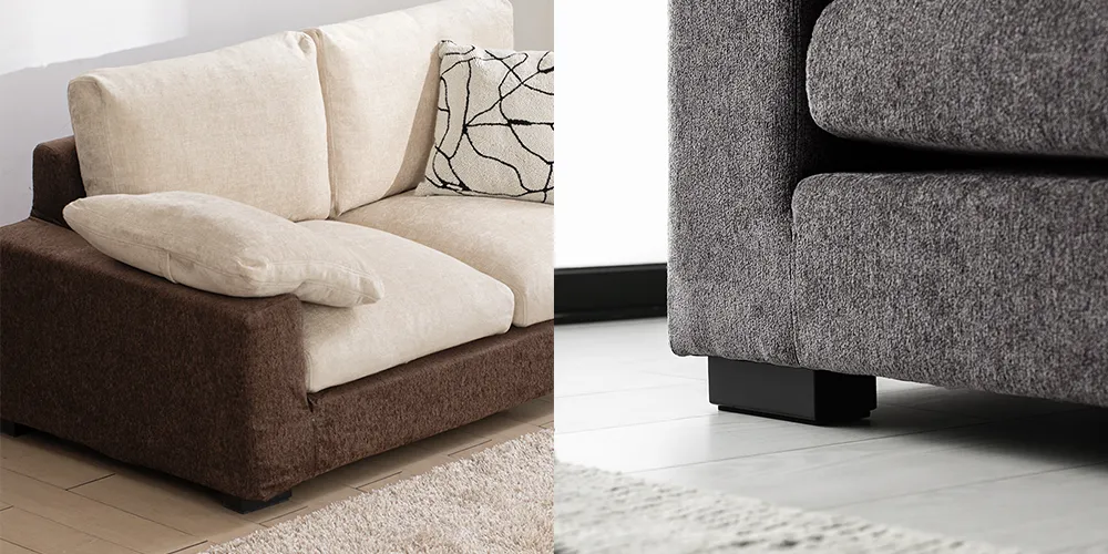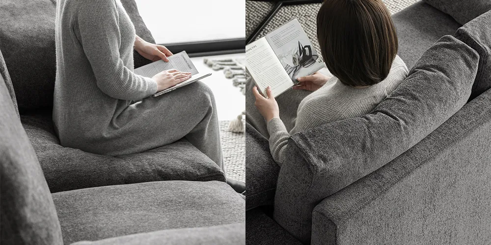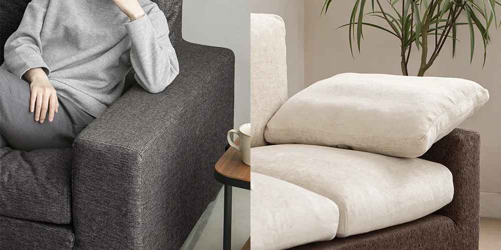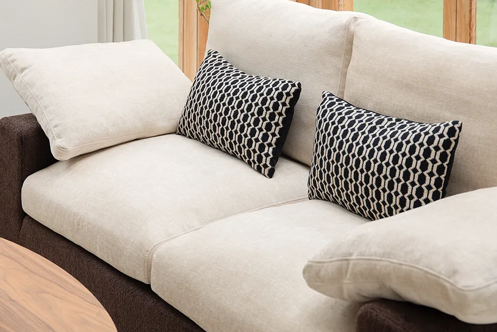座面は、表層に柔らかなフェザーと弾力あるシリコンフィルを混合したソフトなクッション、下層に密度の異なるウレタンを重ねしっかりと体圧を分散するよう構成されています。背面にもフェザーとシリコンフィルをたっぷり詰め込むことで、見た目にも柔らかな立体的フォルムを造り、包み込まれるような弾力のある座り心地をもたらします。