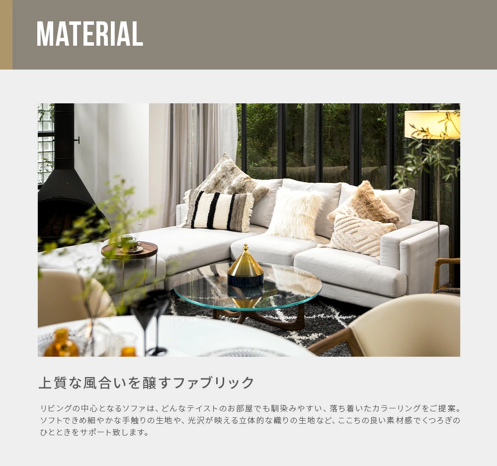 きめ細やかに織り込まれた繊細な素材が存在感を引き立てる、気品のあるテクスチャー。座り心地を高めるしっかりとした厚みと、肌なじみのよい柔らかな質感の生地を採用しました。お部屋に馴染みやすい厳選されたカラーリングが高級感のある仕上がりです。