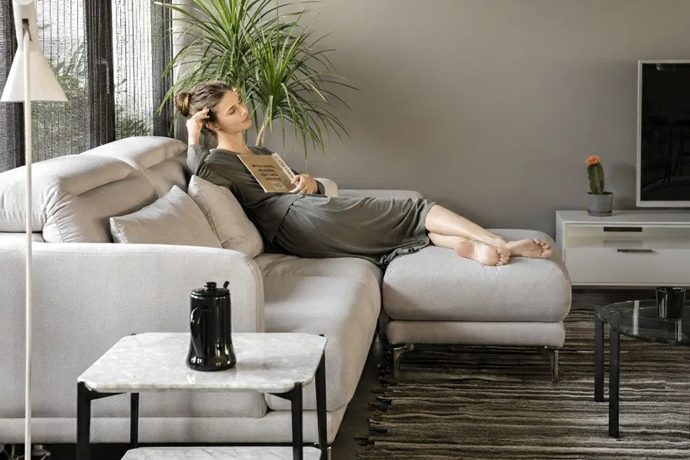 穏やかな休息をサポートする、ヘッドリクライニングを搭載したハイバックなソファ。日々の寛ぎをより心地よく贅沢なひと時へと導きます。