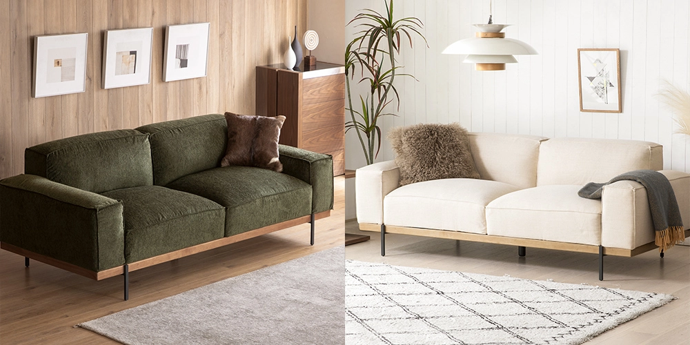 ソファ底部のフレームは、ファブリックに合わせたウッドを採用。ダークグレー・モスグリーンはブラウンカラーを、ライトグレー・ライトベージュはナチュラルカラーを合わせました。温かみを感じさせる木目の質感が高級感のある印象を与えます。