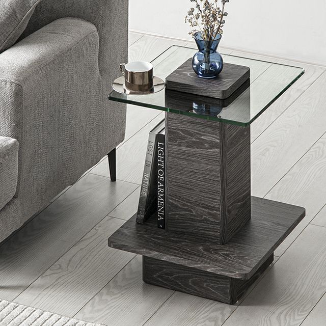 ソファやベッドサイドに配置しても丁度よい高さ設計。圧迫感を感じさせず空間を広くみせる視覚効果があります。2枚板の中心を1本の柱で貫いたようなベースデザインも、天板が浮いているような個性的なシルエットを実現しました。