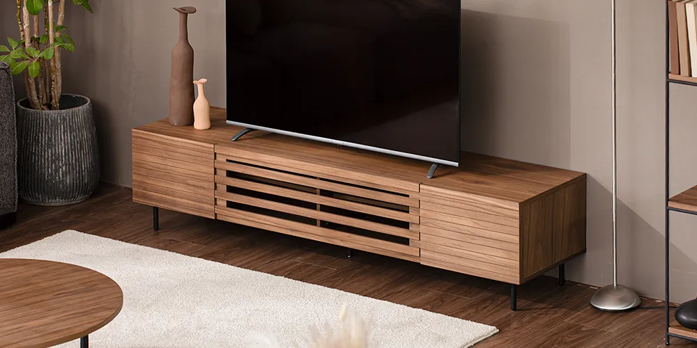 ボードの奥行きは約450mmと、大型のテレビも安定して置けるサイズ設計。小物のディスプレイも楽しめるよう十分な広さを確保しています。