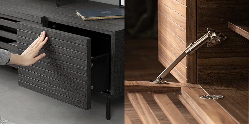 すっきり洗練されたリビング空間を叶える、充実の収納スペース。手前に大きく開くフラップ扉はAV機器もスマートに収納できます。2杯の引き出しはスムーズに動くスライドレール付きで、たくさん収納しても奥の物まで簡単に取り出すことが可能です。