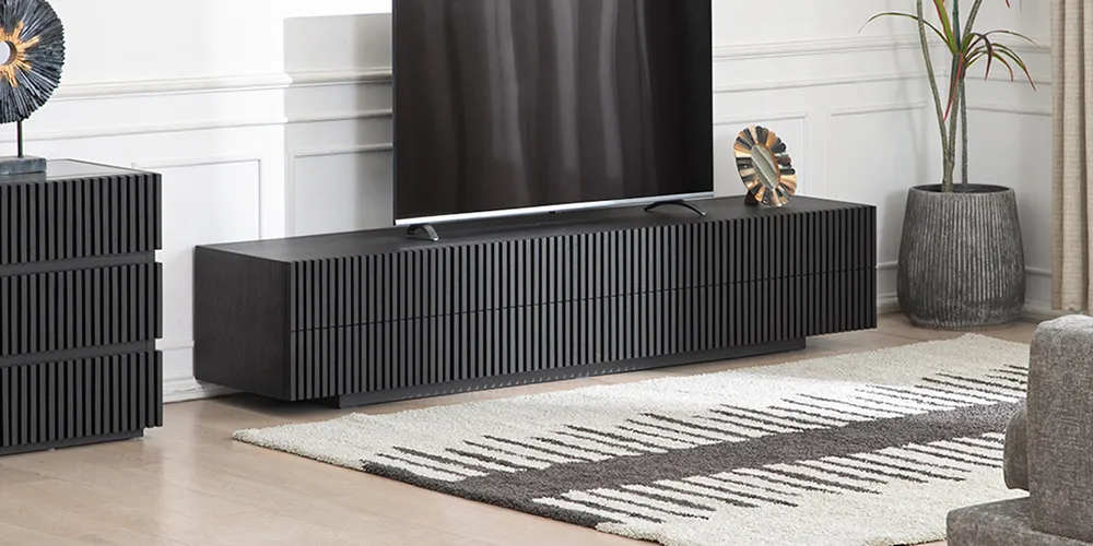 木目の存在感を活かした優美なルーバーデザインのテレビボード。時代に流されない端正な佇まいが長く愛される一台です。