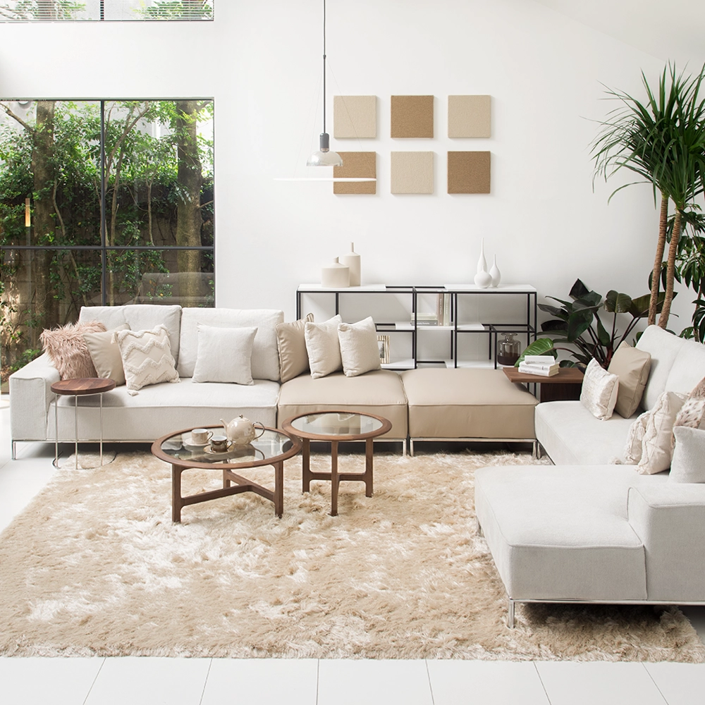 圧倒的なサイズ感と美しさが一体となったソファセットは、まるでホテルのラウンジのような開放感を感じさせます。