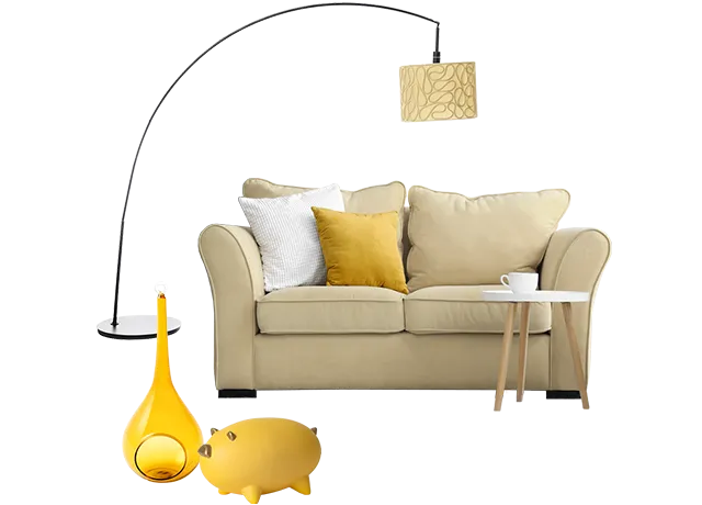 バターイエローのクッションやテラコッタカラーの小物を置くことで、視覚的なコントラストが生まれ