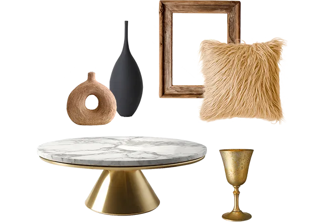 大理石調トップのローテーブルにグリーンの小物を置くことで、ラグジュアリーな色合いと