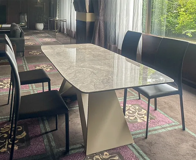 大理石調天板がラグジュアリーな伸縮式ダイニングや木目調テレビボードが、重厚感のある世界観を際立たせます。