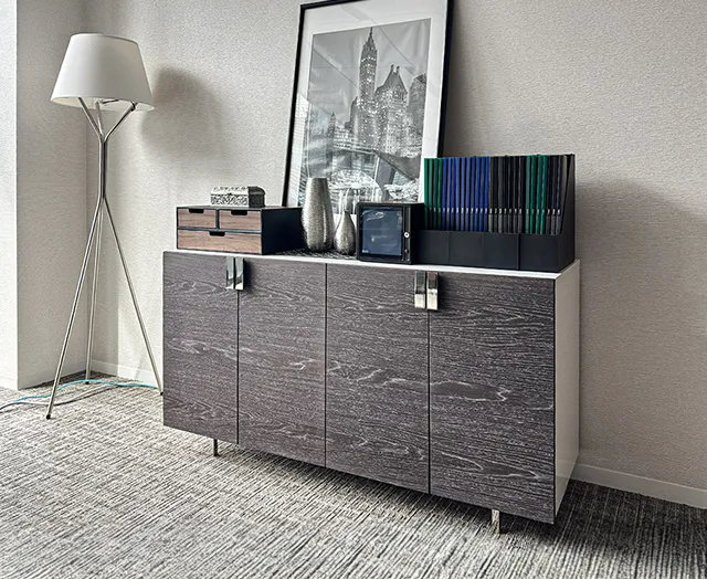 木目が美しいフロント扉と鏡のように艶やかなボディの異なるテクスチャーの絶妙なバランスが美しい、気品に満ちたチェスト。さらにメタリックに艶めくステンレスの取手と脚部がボディの存在感をより際立たせます。