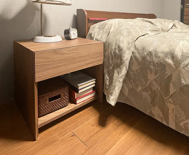 ウォールナットのぬくもり溢れるサイドテーブル。引き出しや収納棚を備え、実用性にもこだわりました。