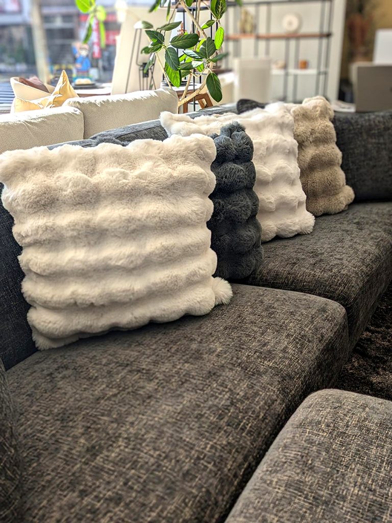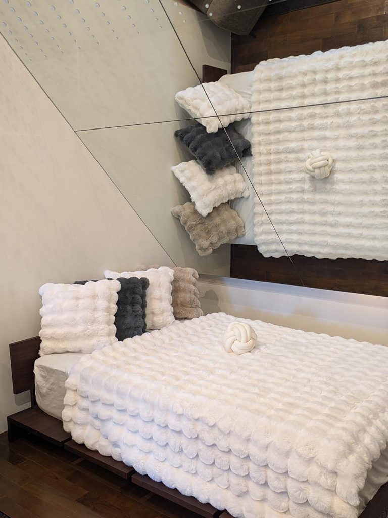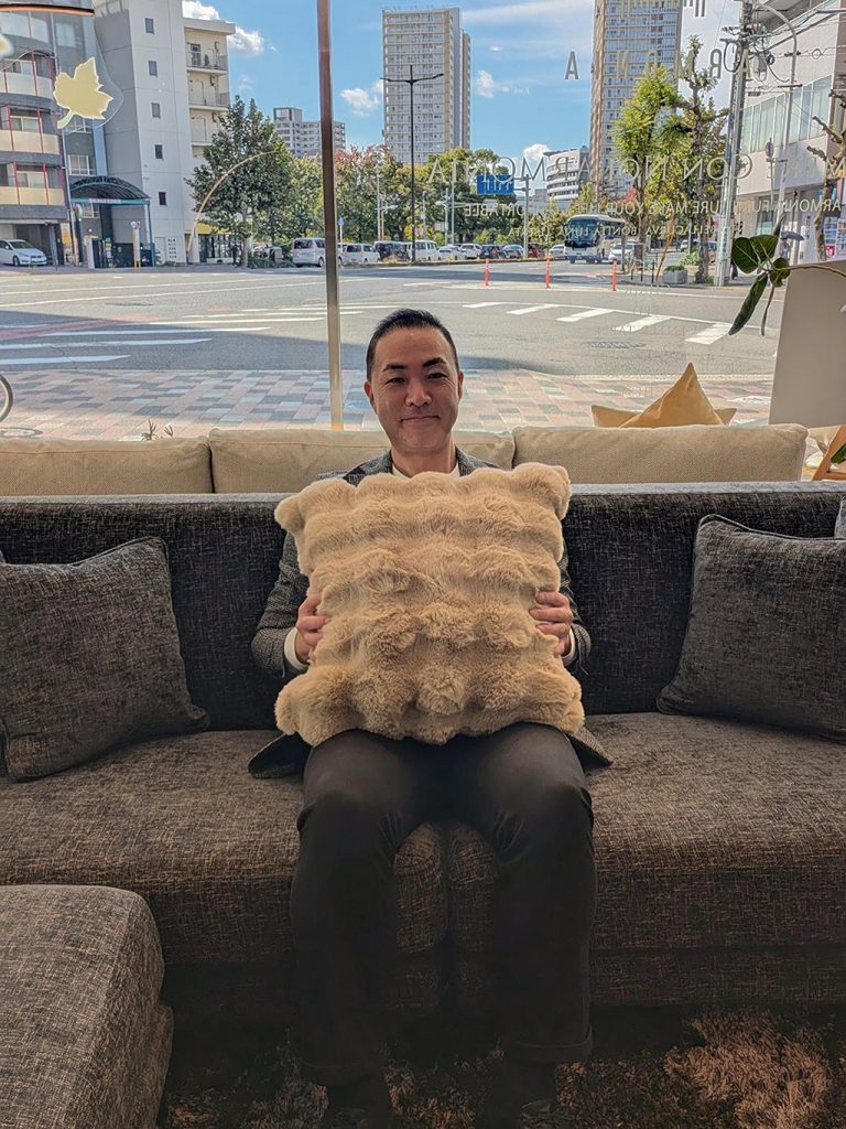 また、主にソファに置く事の多いクッションですが、お薦めのコーディネートは、同じモコモコのブランケットと合せてベッドに置いて頂く事です!