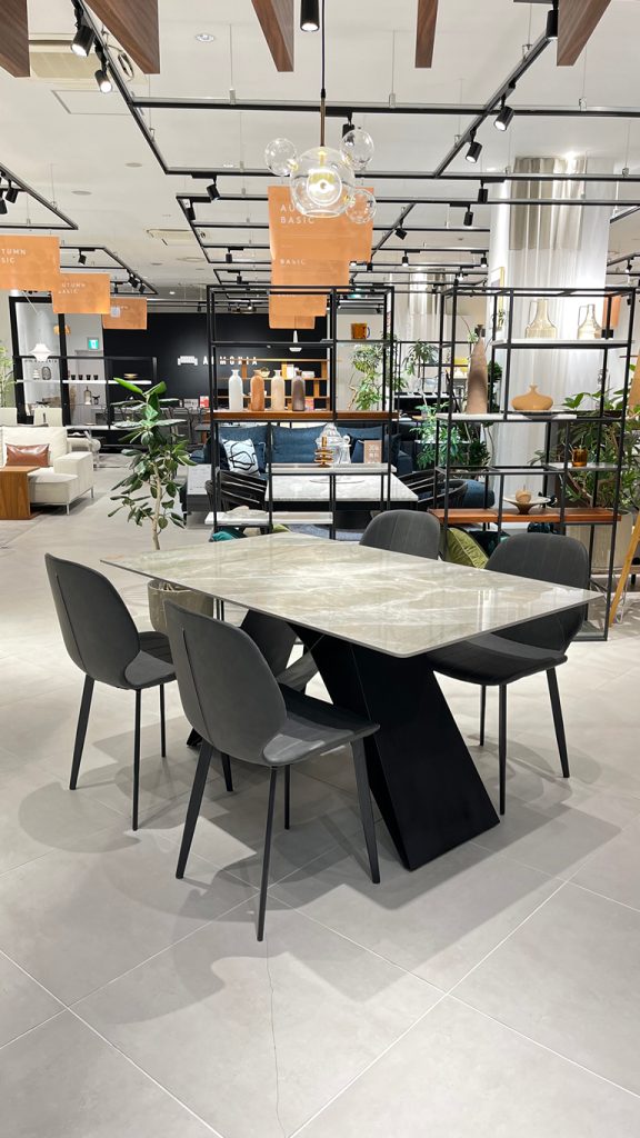 アクセントの効いた脚と美しく高級感のある天板が特徴のダイニングテーブル。