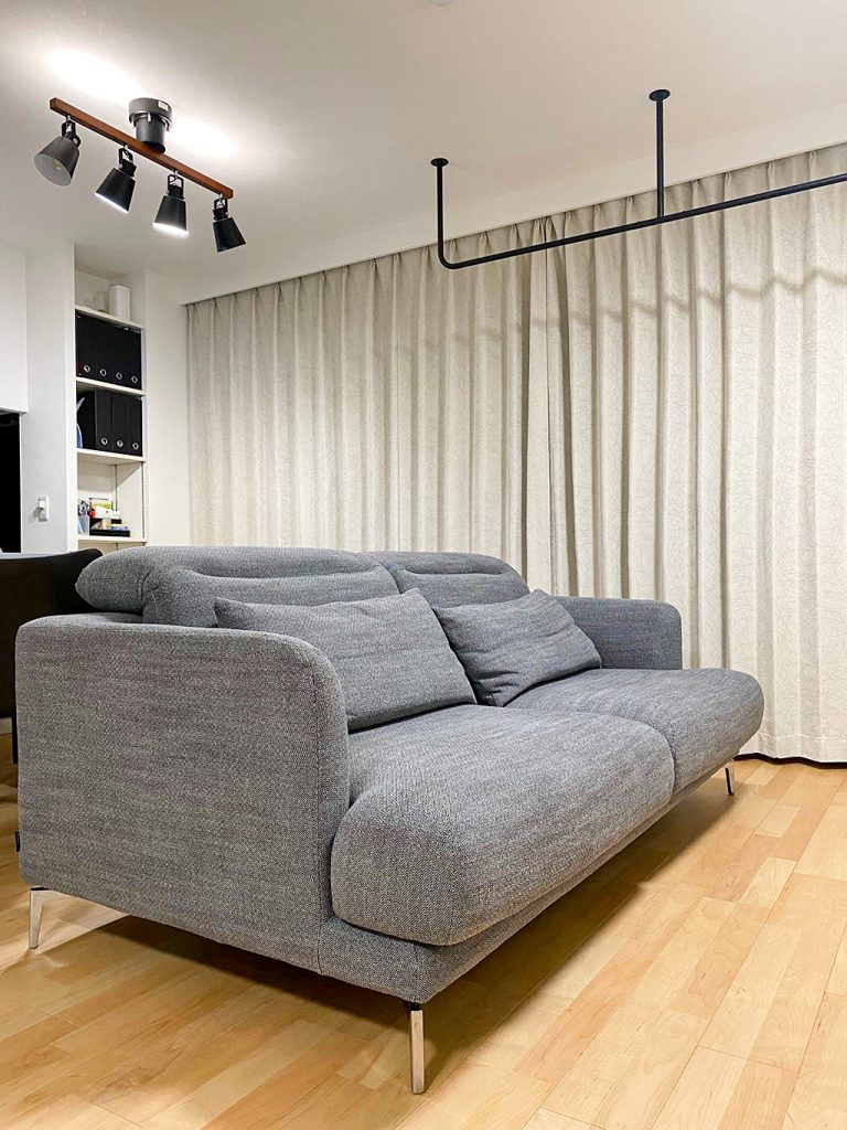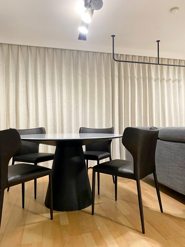 カーテン・床材の柔らかいカラーの中に、差し色のブラックを取り入れ