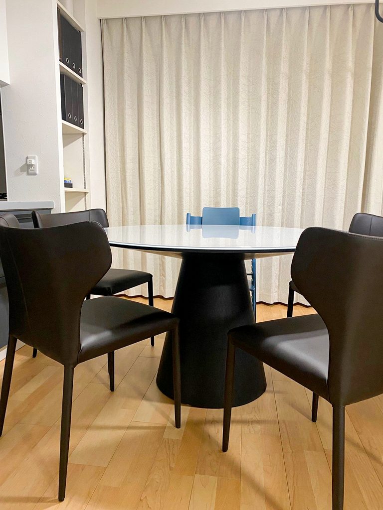 椅子を斜めに配置することで4脚+お子様用のチェアを配置しても広々お使い頂けております。