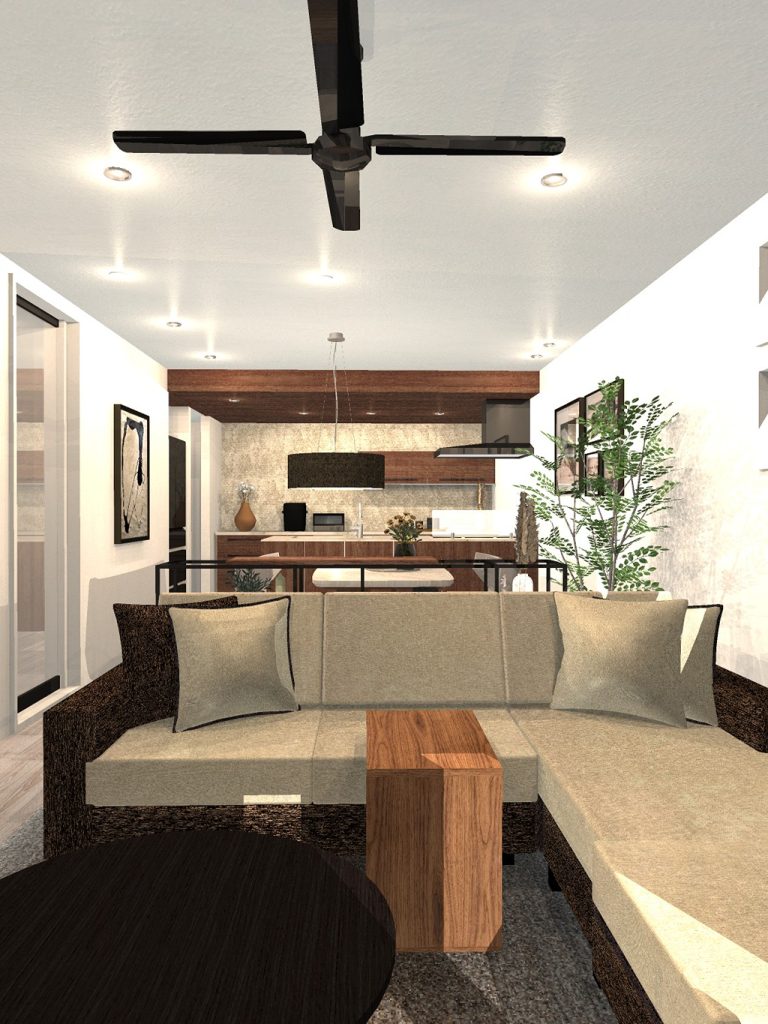ソファ以外はお任せ提案で、お客様からはホテルライクは好きだけど木の雰囲気は取り入れたい。