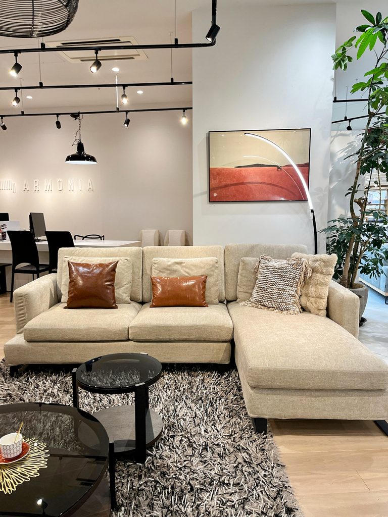 最近ホワイトカラーのソファをお探しの方が多い印象です。しかしホワイトカラーのソファだと汚れが心配でなかなか手が出しずらいですよね。グレージュはホワイトのような上品且つ高級感があるお色味ながらも、ホワイトほど汚れが目立たないという点で非常に人気です。人気商品のLUSSY(テレビボード)のウォールナットと合わせると、空間をより上品な印象にしてくれます。
