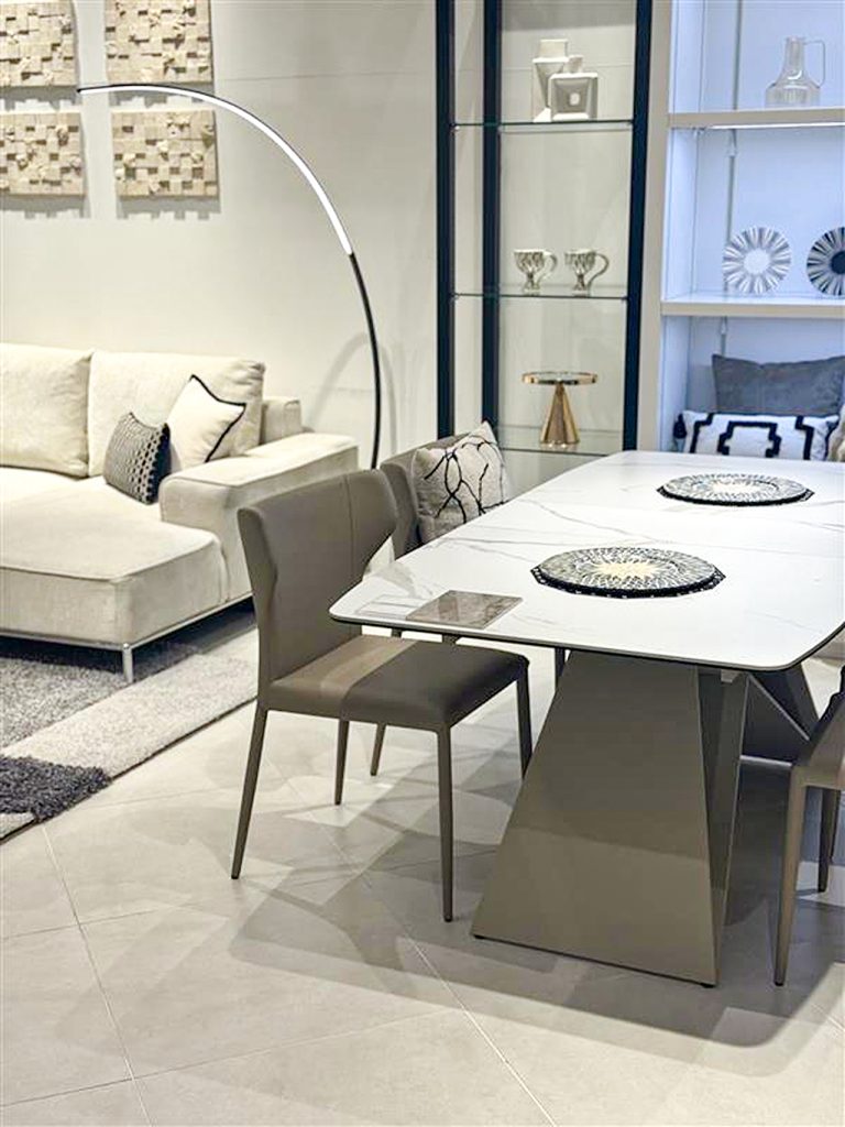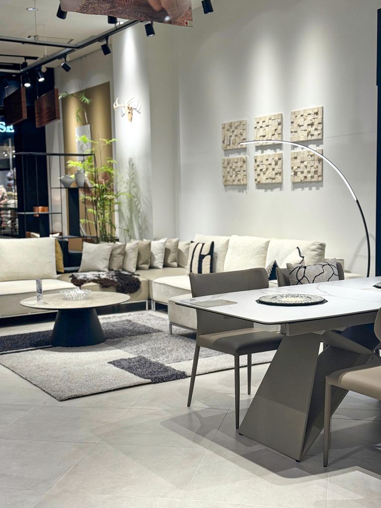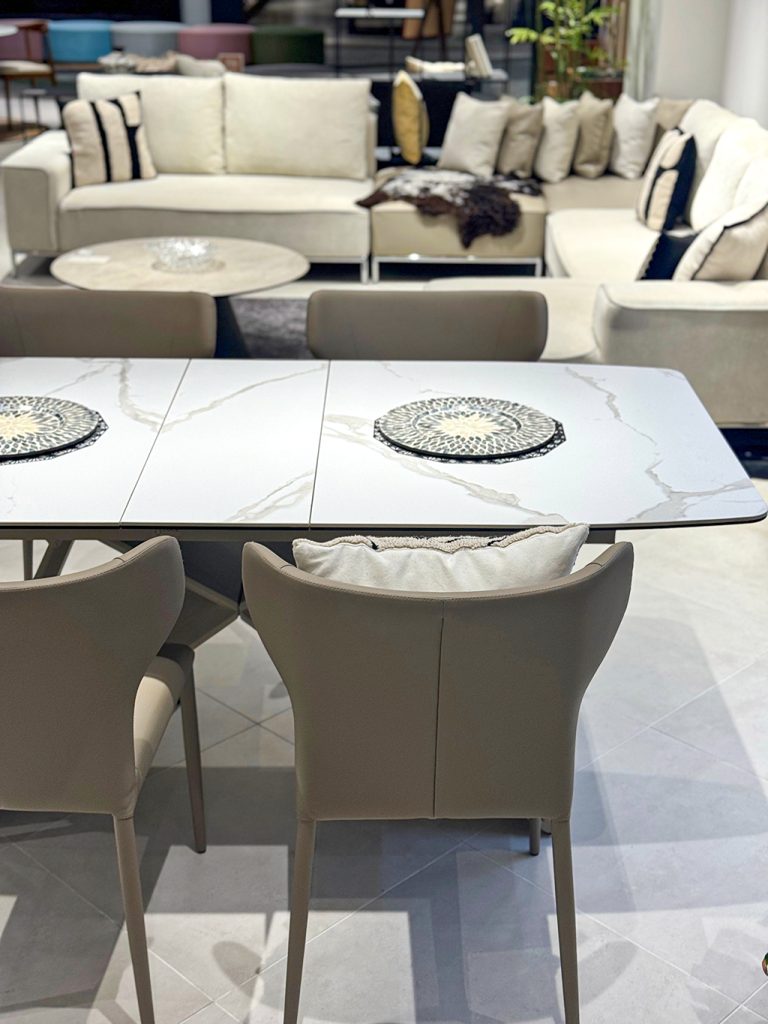ソファ・ダイニング天板はホワイトを基調に、グレージュアイテムでコーディネート。