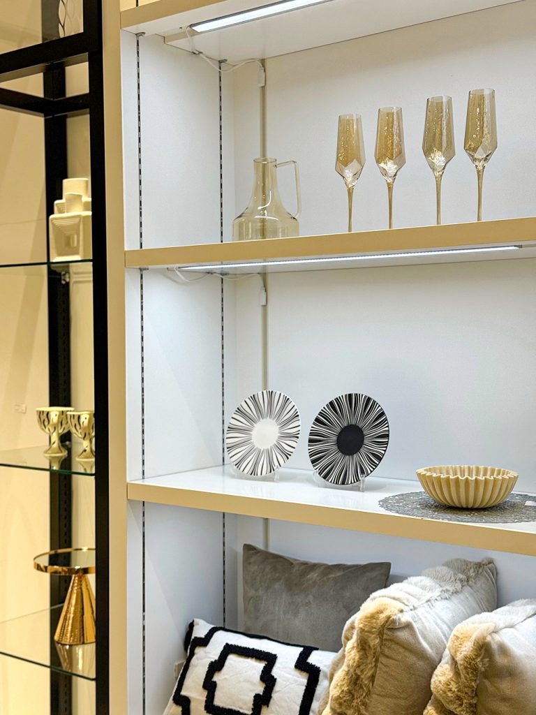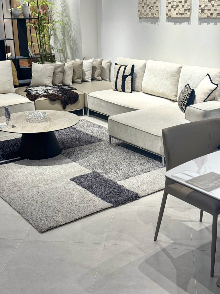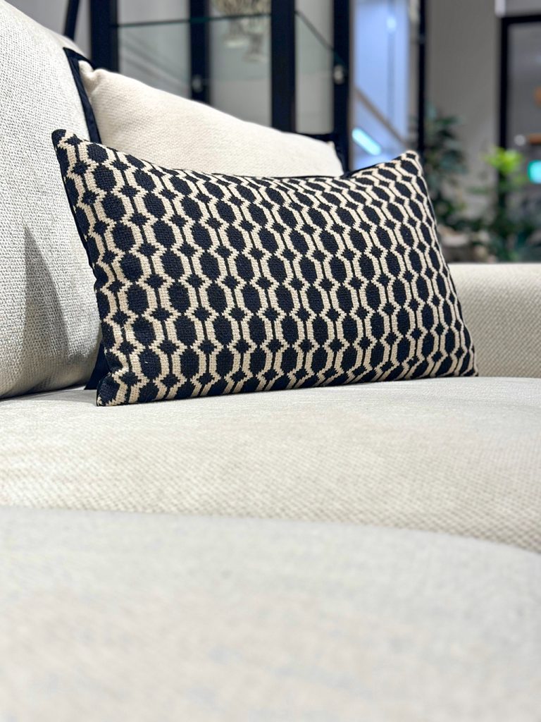 ブラックは主張しすぎない程度に、黒単色の小物やクッションは避け、幾何学模様や一部黒が入った小物を採用。