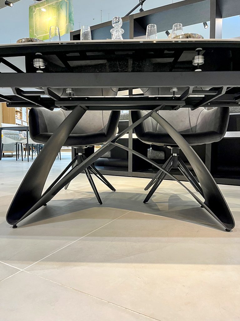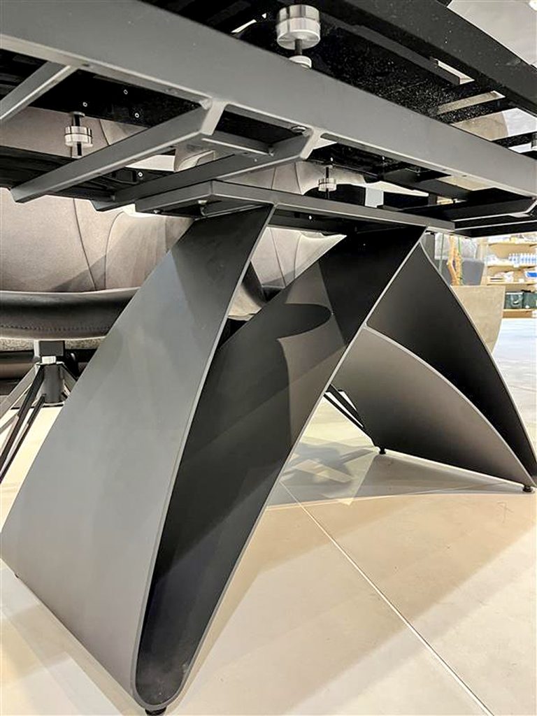 男心をくすぐるような近未来感のあるデザイン。脚部パーツが薄いながらも曲線を描き重厚感あるシルエットになっております。1600㎜から2200㎜まで伸ばせる拡張式になっており、来客にも対応できるサイズ感になっています。