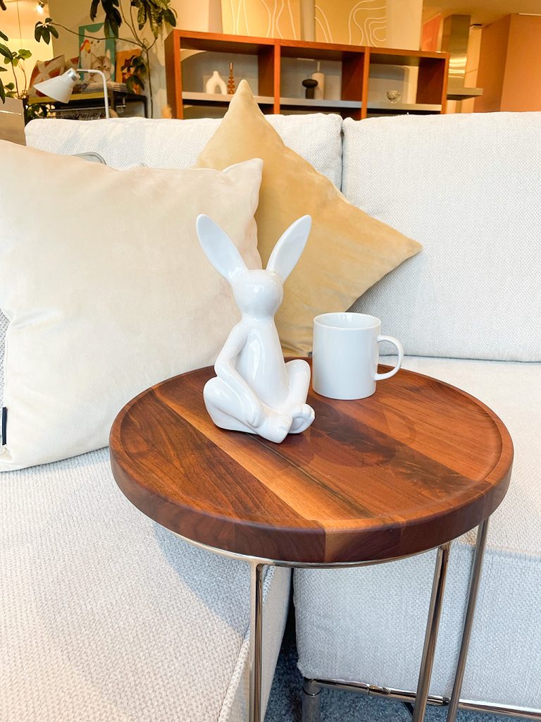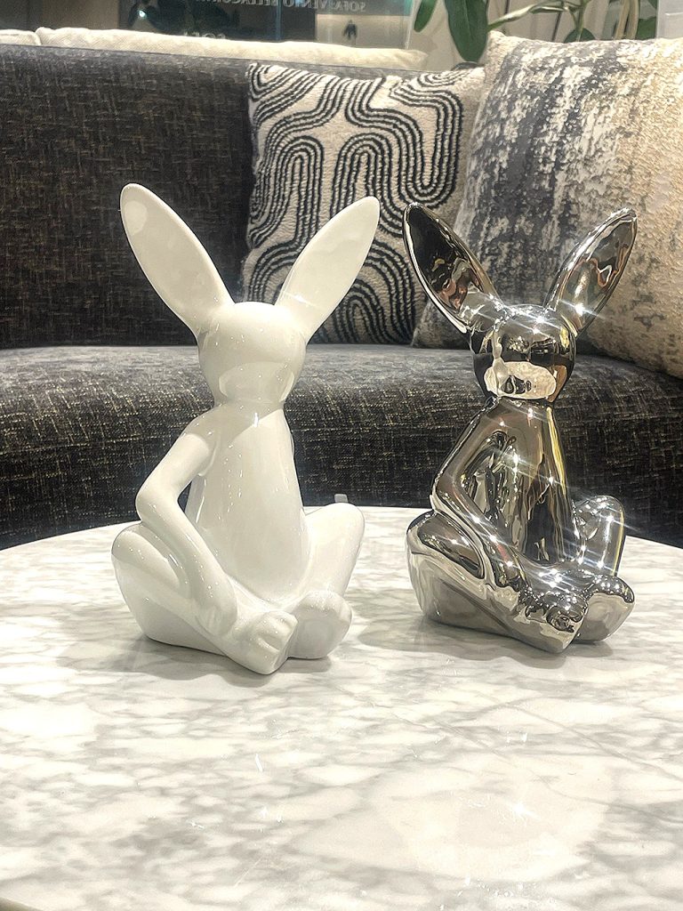 あぐらをかいて座るユニークな形のウサギのオブジェで、見ているだけでも「かわいい、、、」