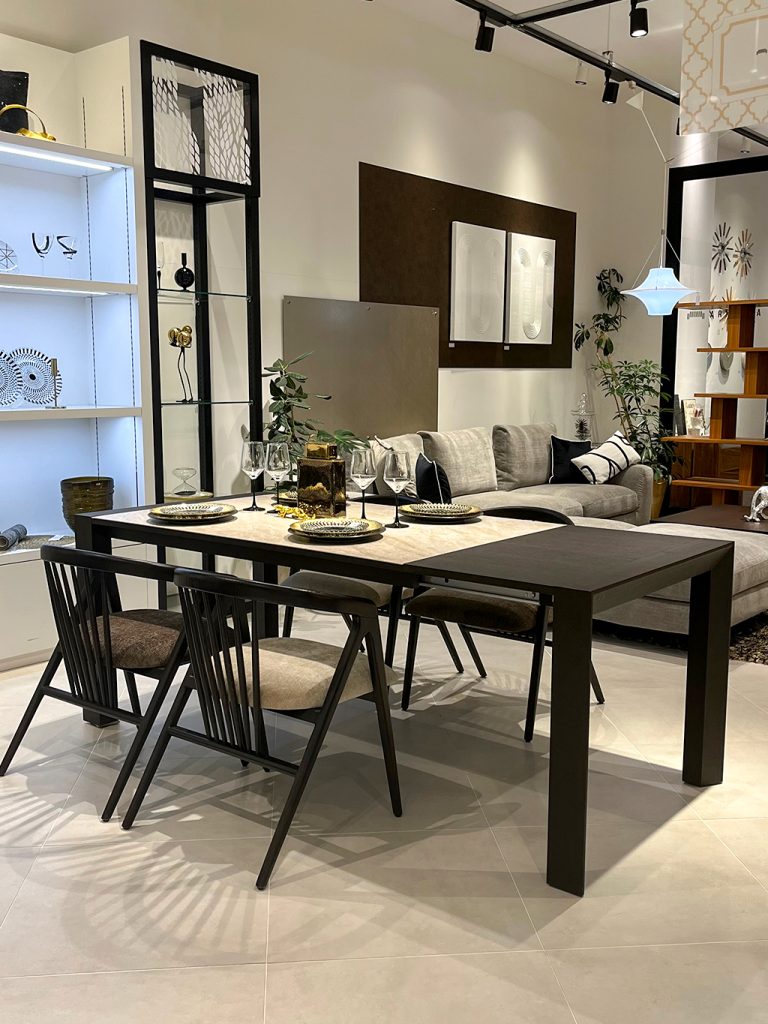伸長式ダイニングテーブルのご紹介ですが、セラミック天板と木のフレームのコントラストが特徴的なテーブルになります。
