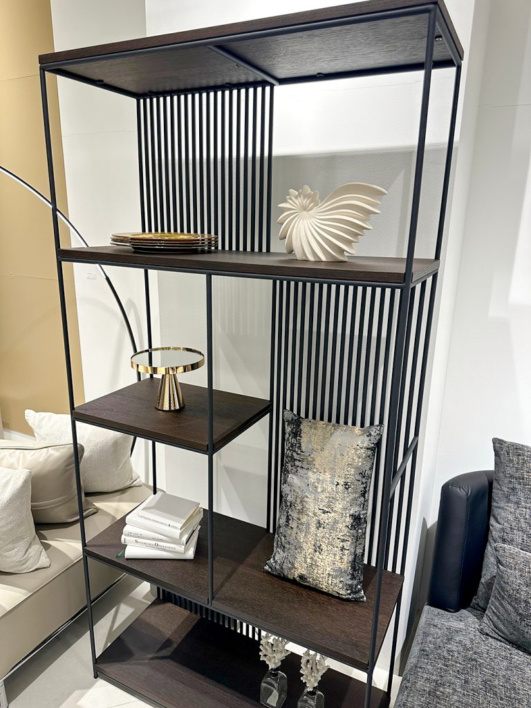 シェルフは新商品の【Bramo(ブラーモ)】を配置し、格子デザインとダークオークカラーの天板は