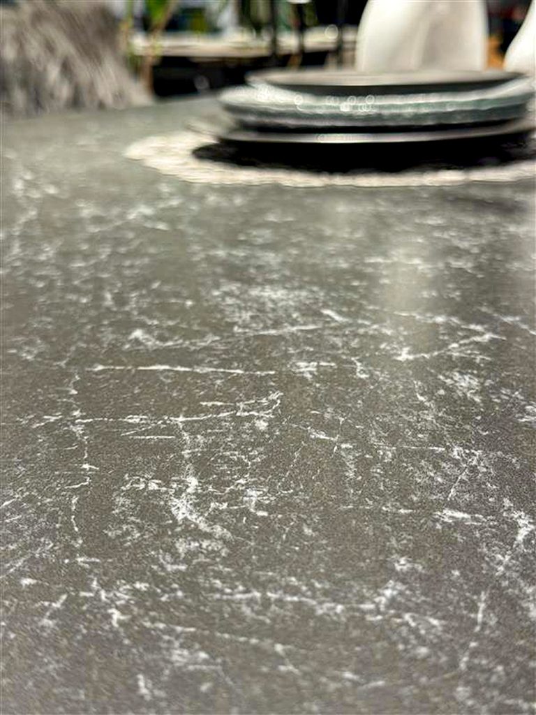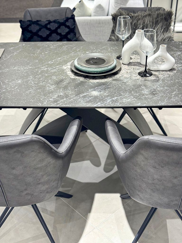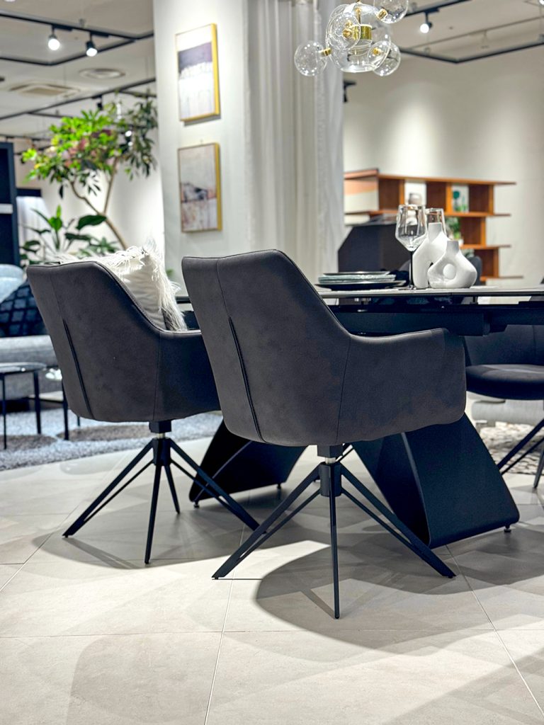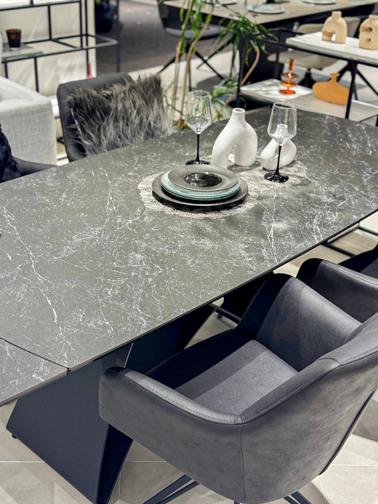 ラグジュアリーさを出すために、生地感にまだらな光沢感・ダイニング天板は大理石柄のブラックセラミックを採用。