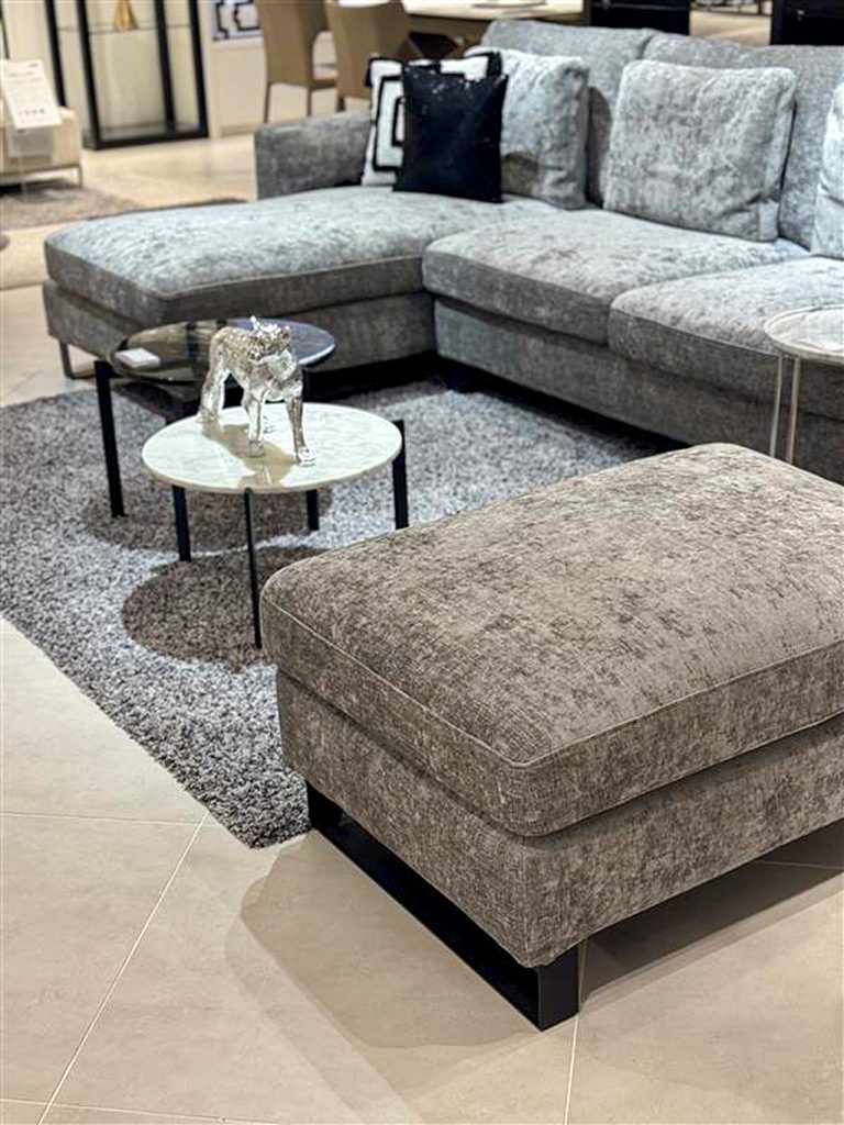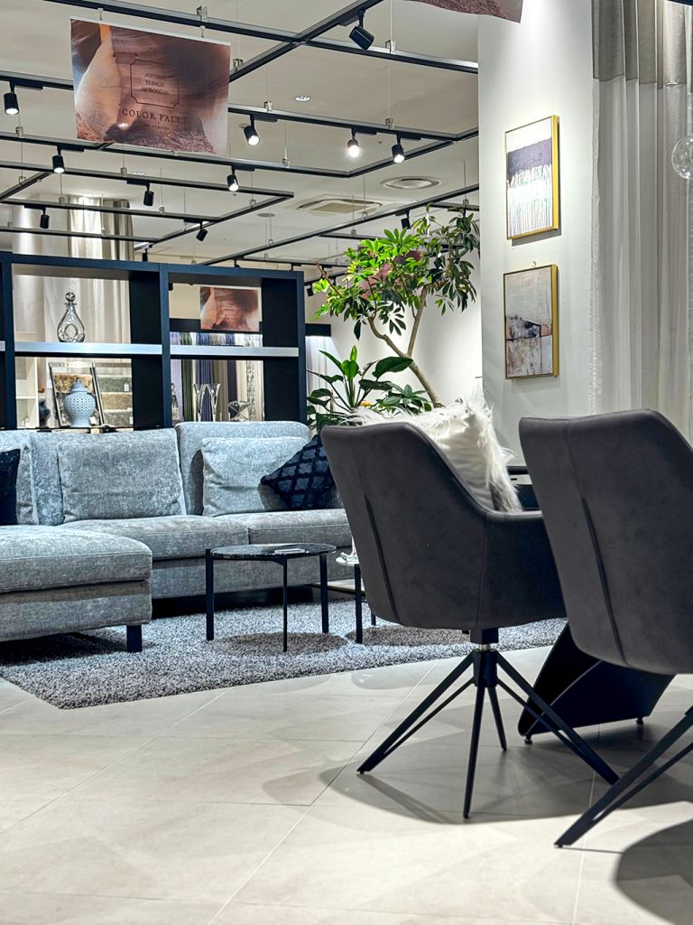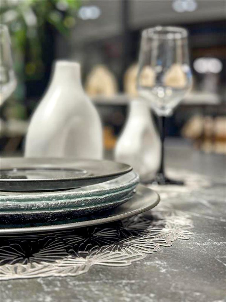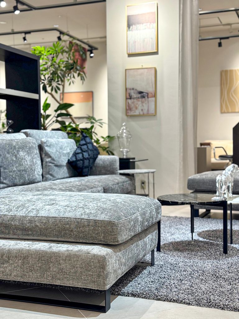 ラグジュアリーさを出すために、生地感にまだらな光沢感・ダイニング天板は大理石柄のブラックセラミックを採用。