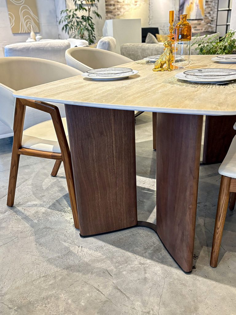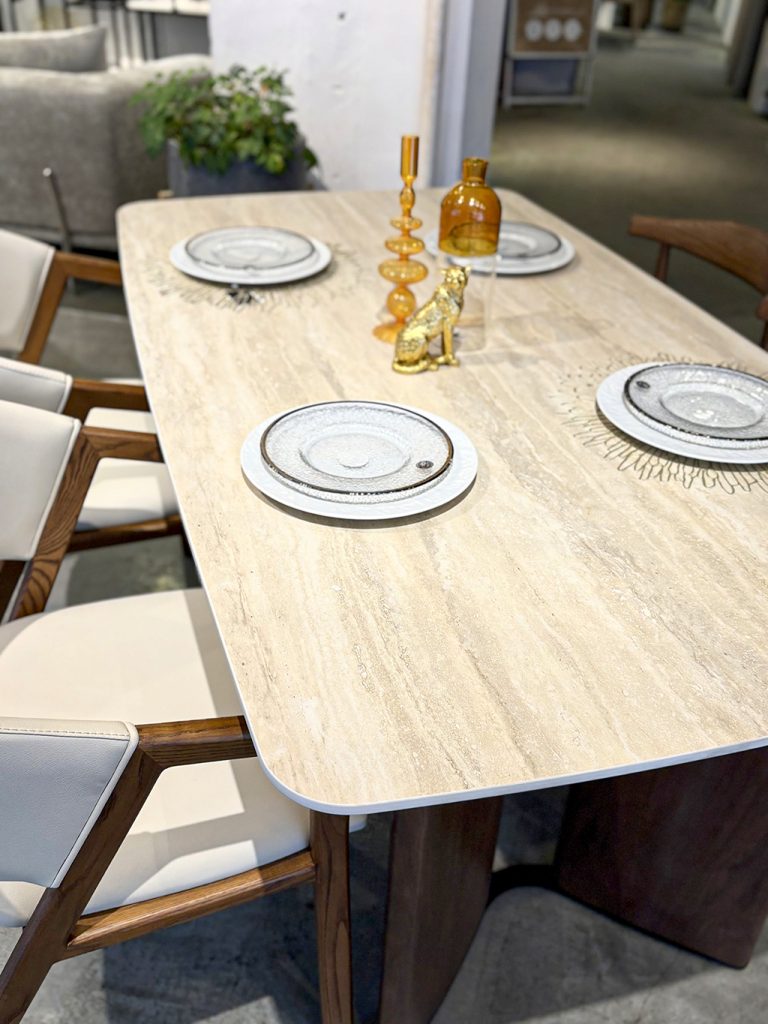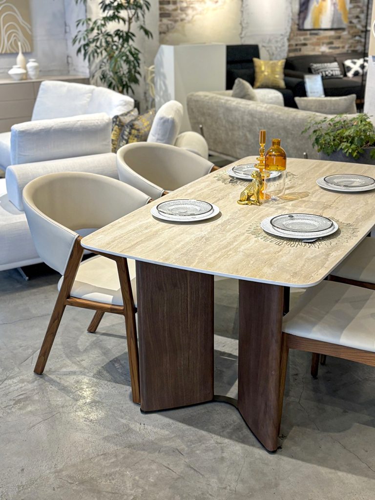 2色展開のうちウォールナット×ベージュセラミックカラーでは、トラバーチン調のセラミック天板となり、モダンな中にも温かみを感じるデザイン。