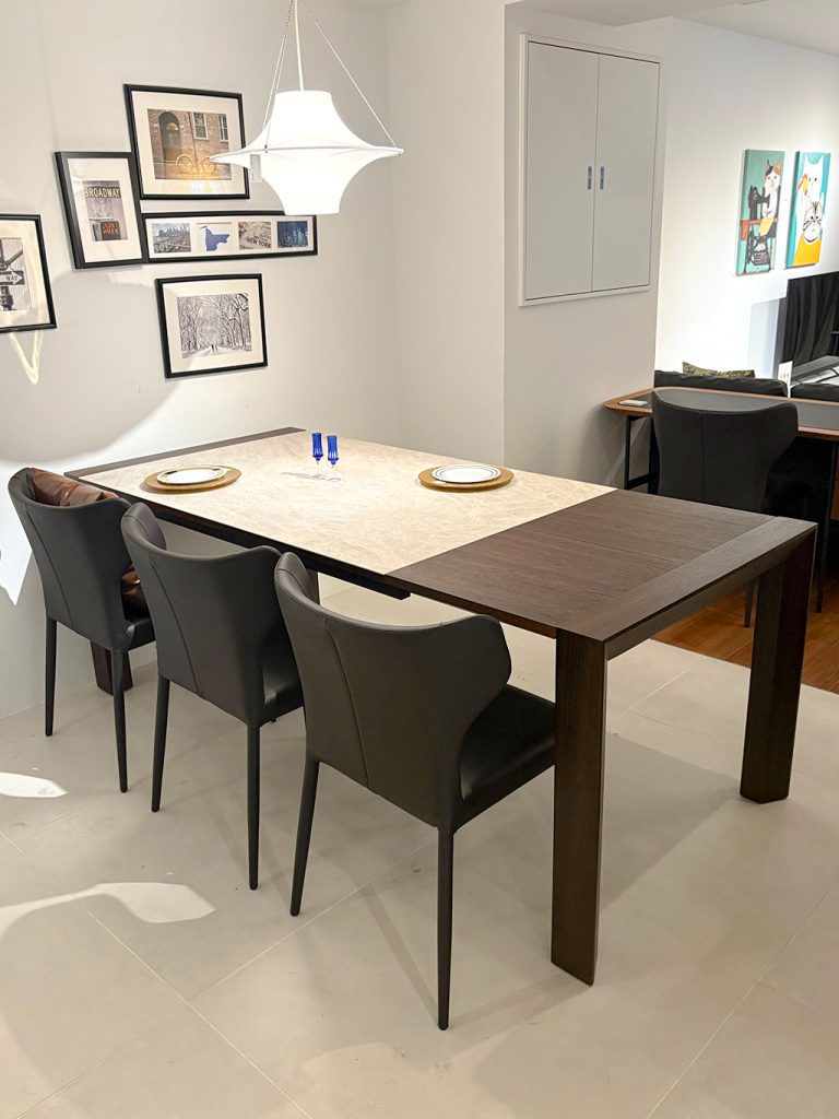 また、天板をセラミックと脚部同色の突板でセパレートにする事により、伸長式天板特有の天板に表れる継ぎ目をデザインの一部として消化しています。