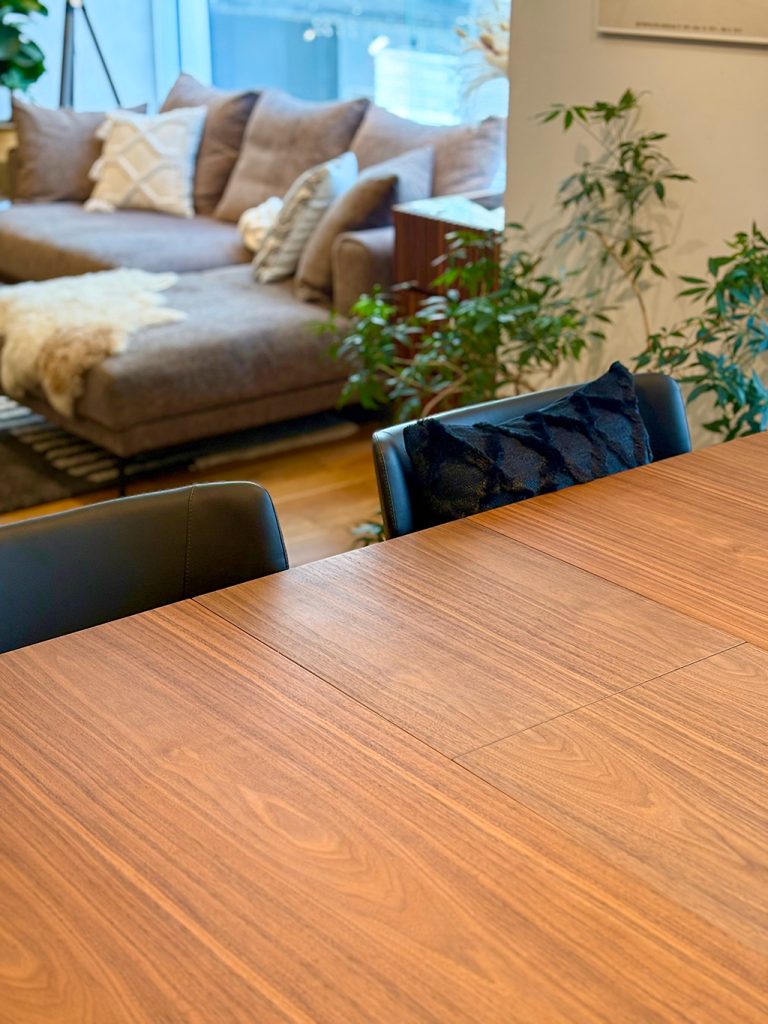 尚、一般的にダイニングテーブルは木目が長手方向に流れるものが多いですが、あえて短手方向に貼る事で伸長部分の継ぎ目を見えにくくしたデザイン。