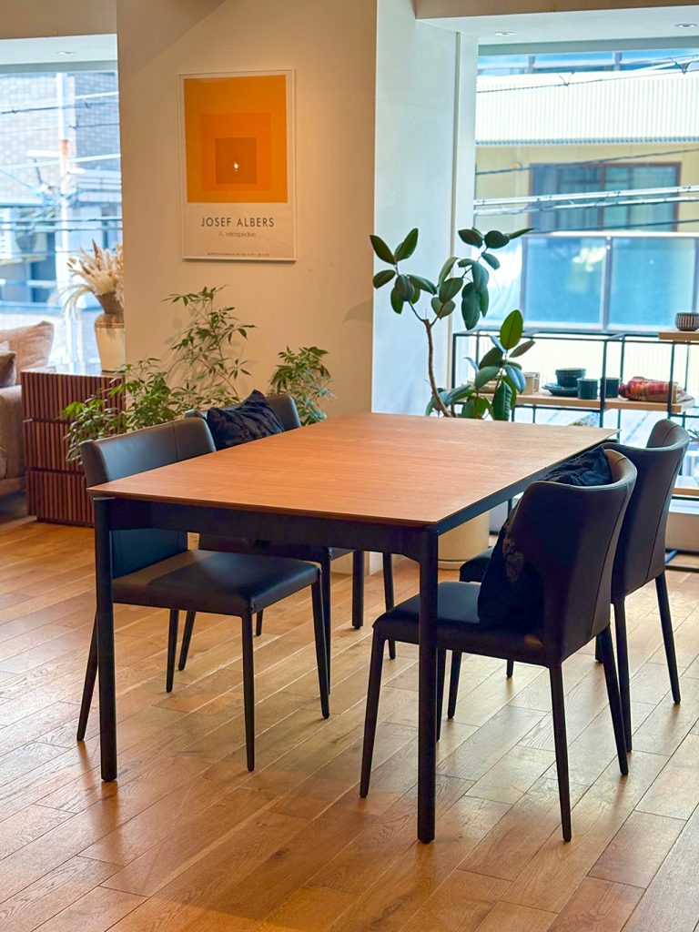 伸長前でもW1600mmと4名様がゆったりとご利用頂けるサイズ感ですが、天板伸張時にはW2000mm迄大きくなる設計。