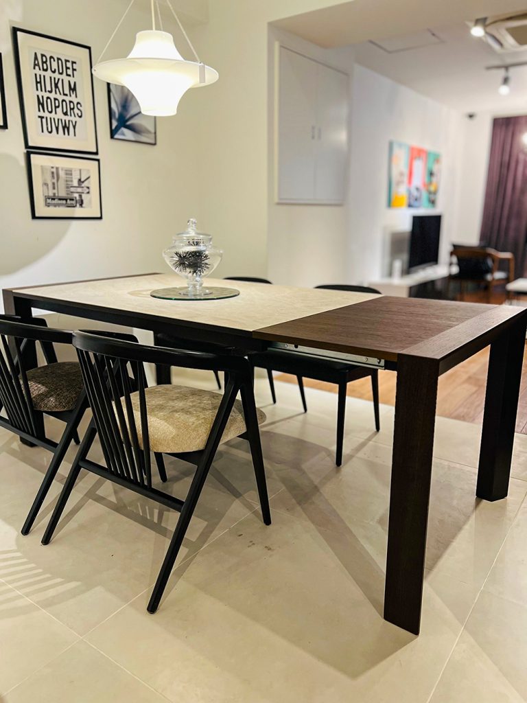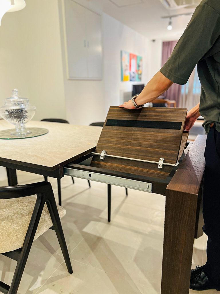 さらに天板だけが伸びるのではなく脚部ごと動いて大きくなってくれる為、チェアを入れ込むスペースがしっかり確保できるのも魅力的な所。