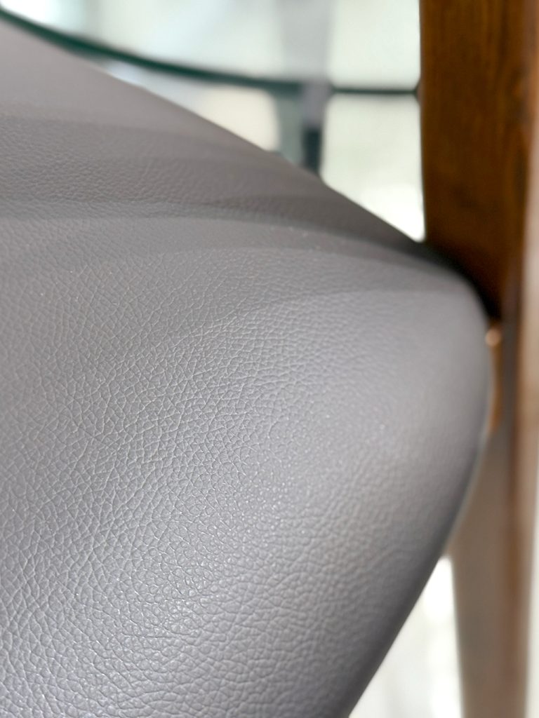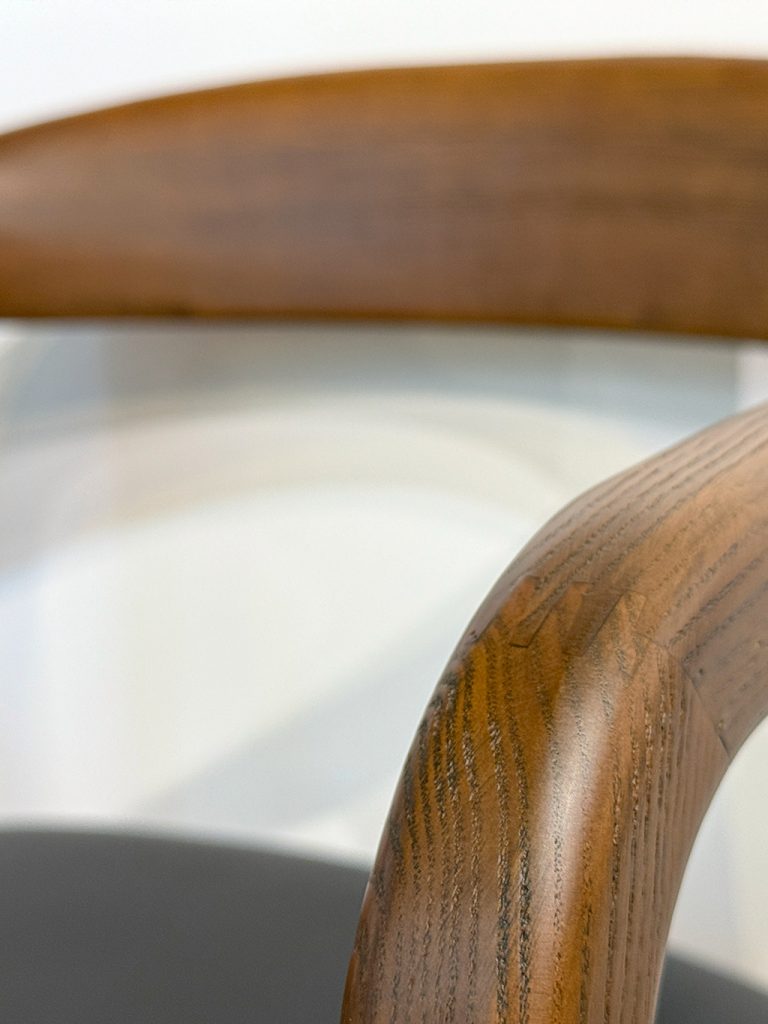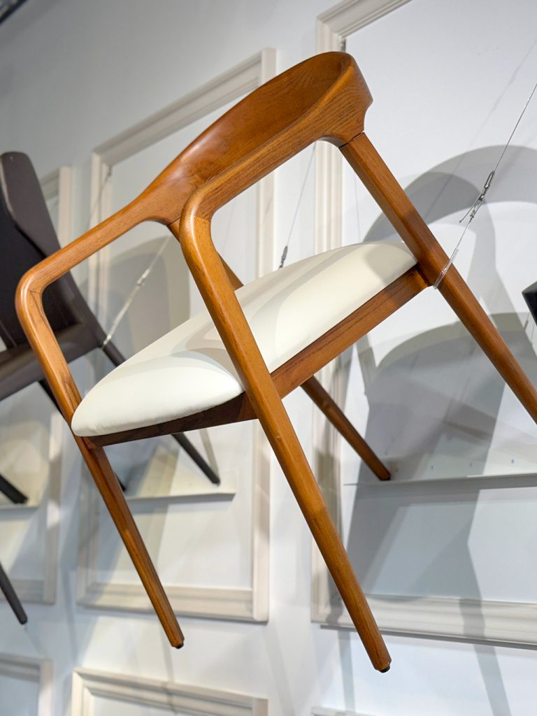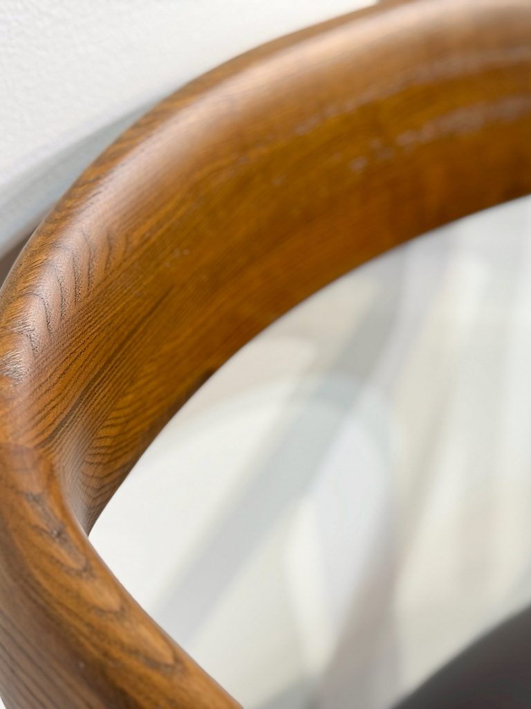 【体を包み込む異素材融合のダイニングチェア hmd06】 趣き深い天然木とレザーのコントラストが上品なダイニングチェア。 丸みを帯びた曲線で木材の質感をダイレクトに感じる手触りがよく、食事中もつい肘掛を触りたくなります。